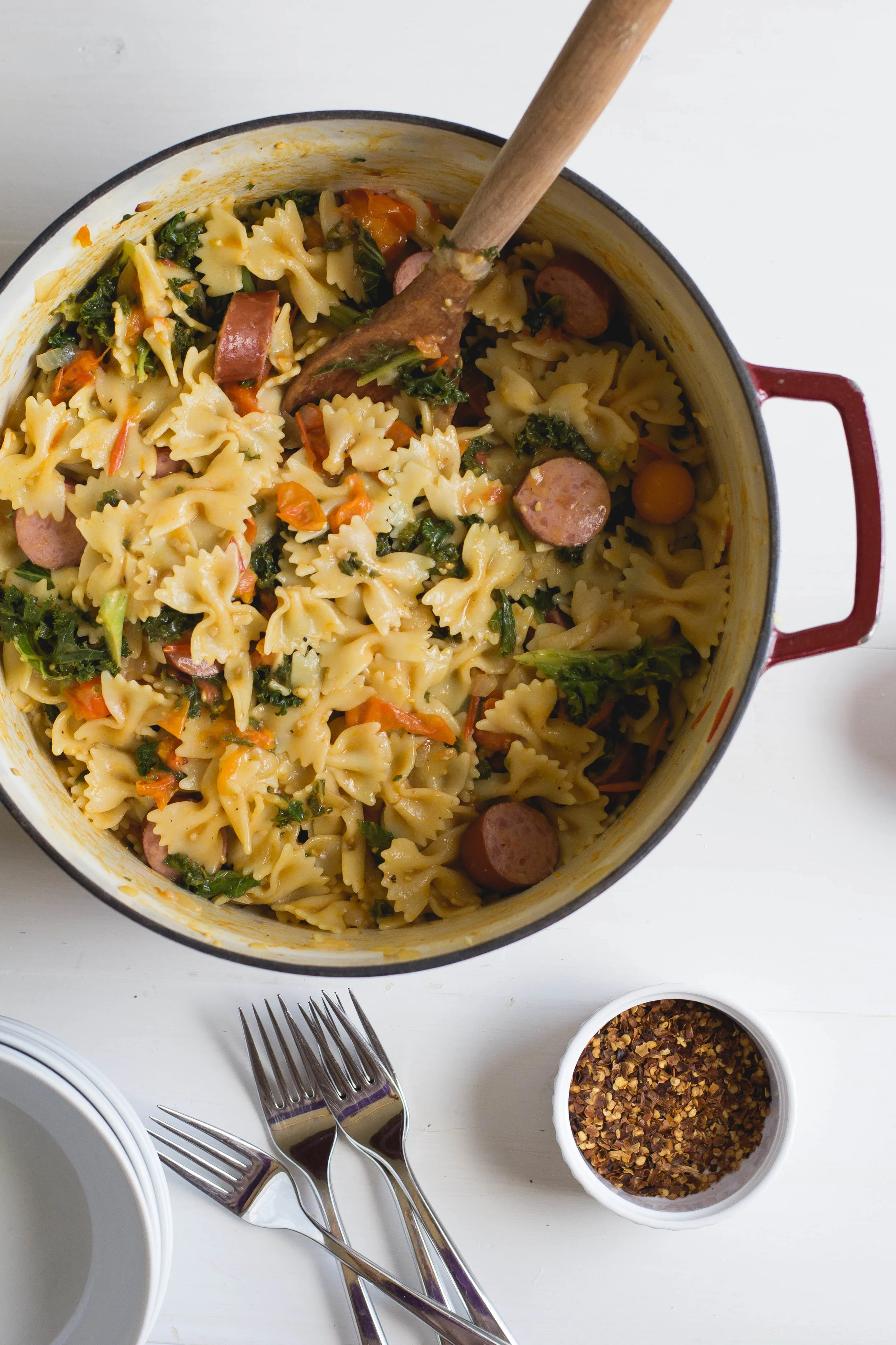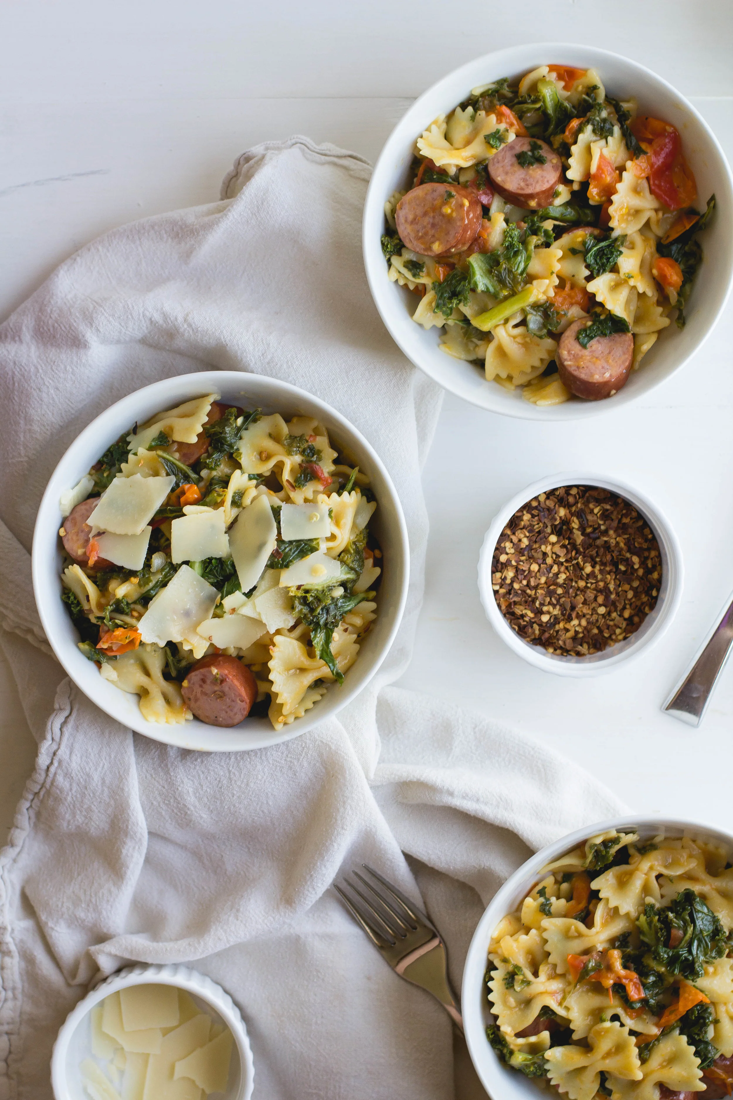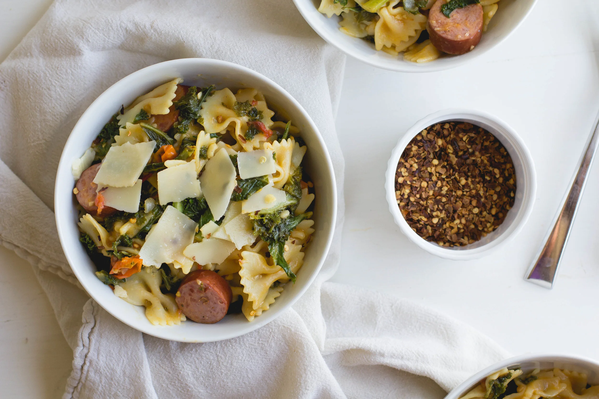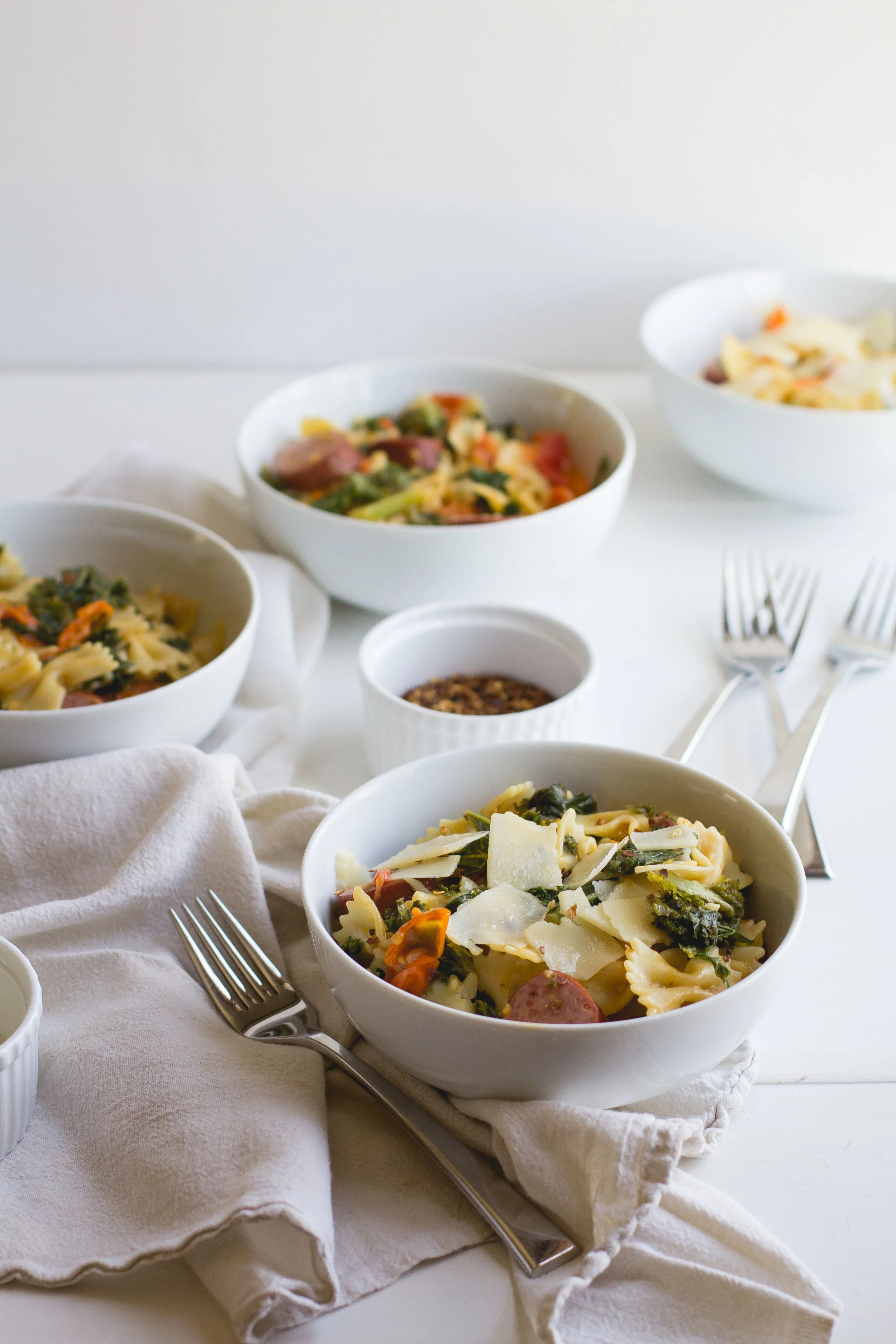 Pasta with Smoked Sausage, Cherry Tomatoes + Kale