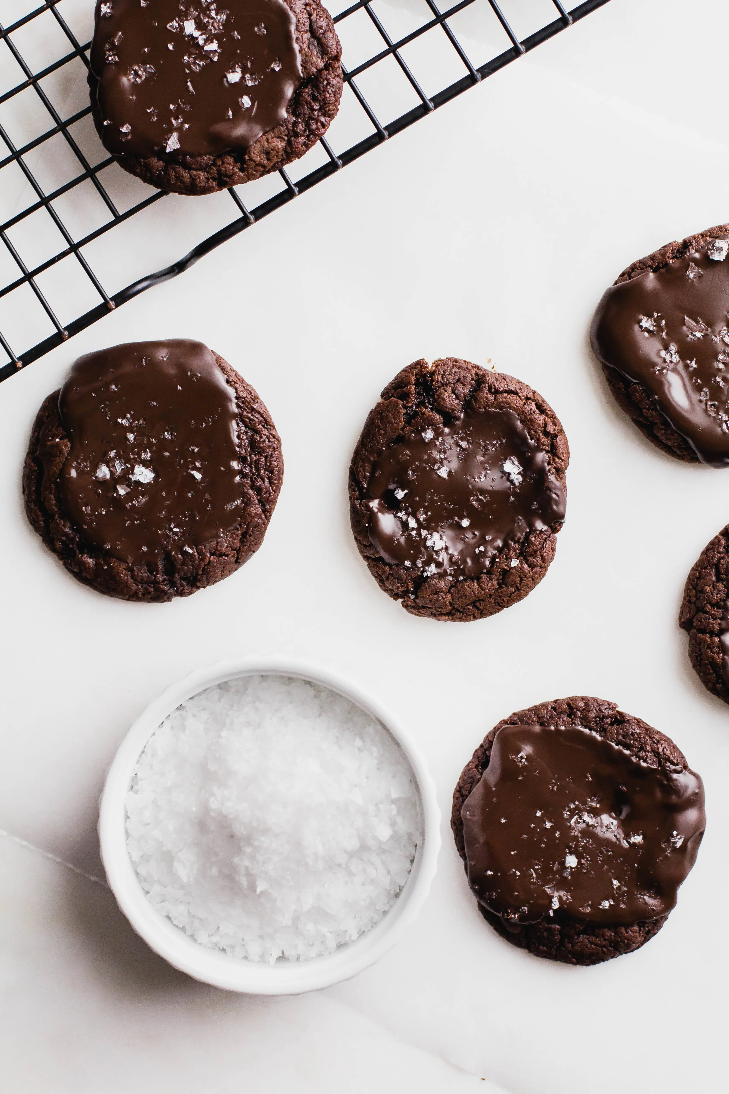 Bake for 9-11 minutes. Immediately after taking the cookies out of the oven, place an Andes mint or a dark chocolate chunk on each cookie. Let the chocolate melt a bit, then spread the melted chocolate over the cookie with a spoon. If you’re making the Chocolate + Sea Salt version, sprinkle a pinch of sea salt onto the melted dark chocolate.
